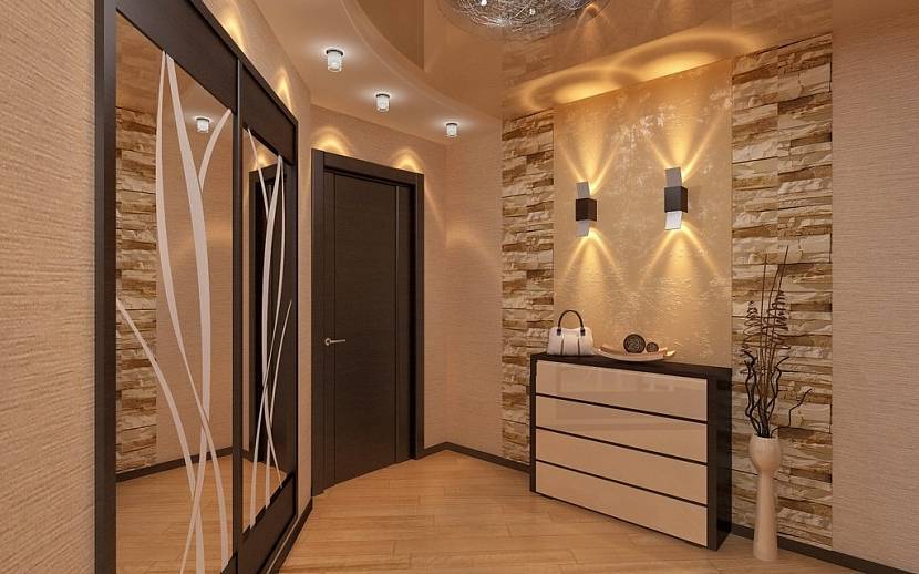 Помещение будет выглядеть холодным и неуютным и напоминать склад или офис. Достаточно будет декорировать 1 или 2 смежные стены в светлых тонах. Коридор — достаточно темное помещение, и использовать в нем коричневый ламинат будет неуместно, в особенности если оно маленькое и узкое
