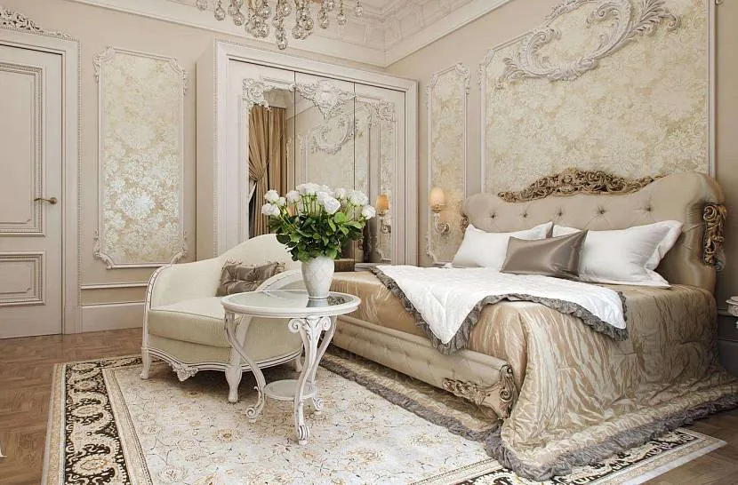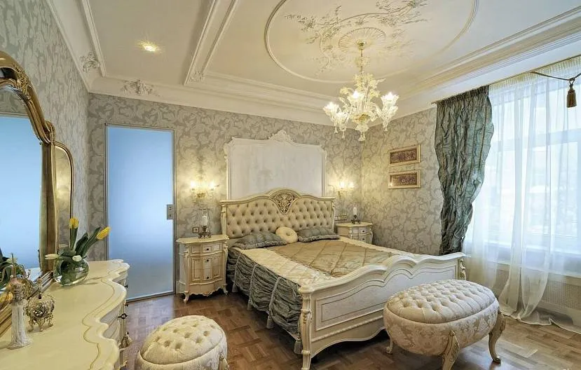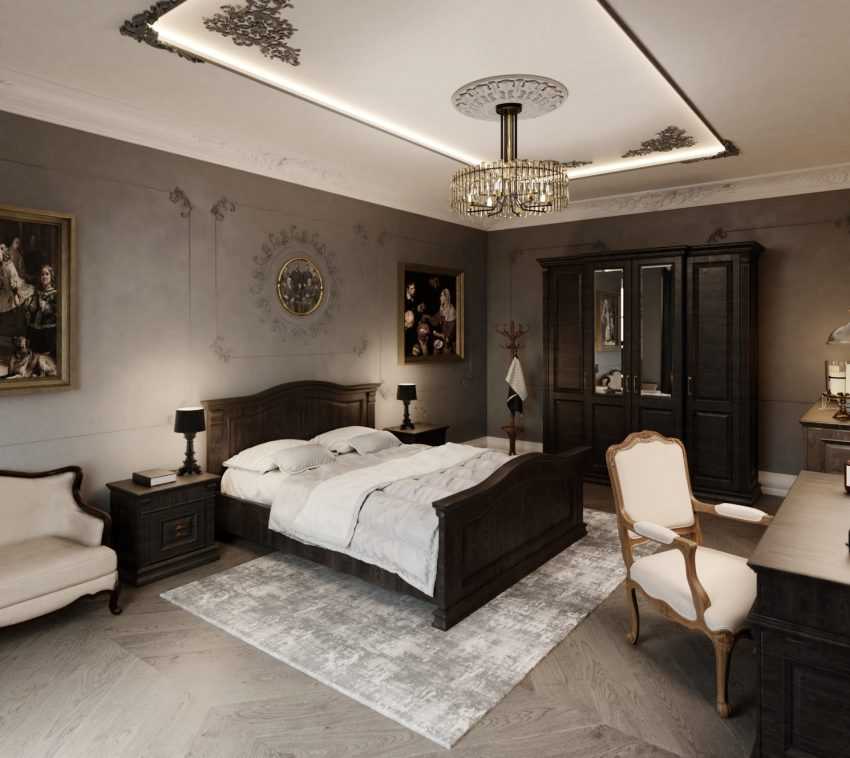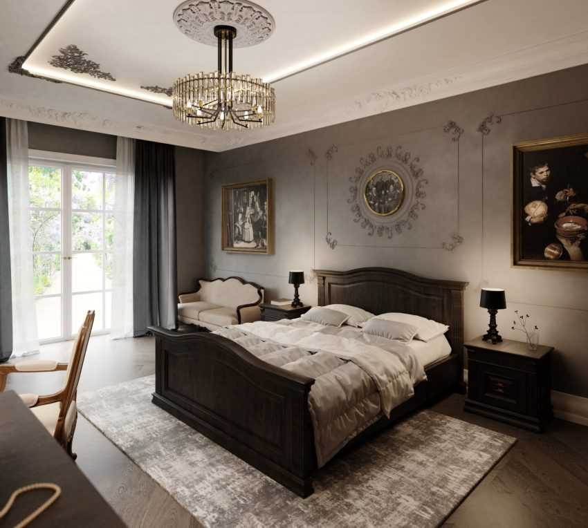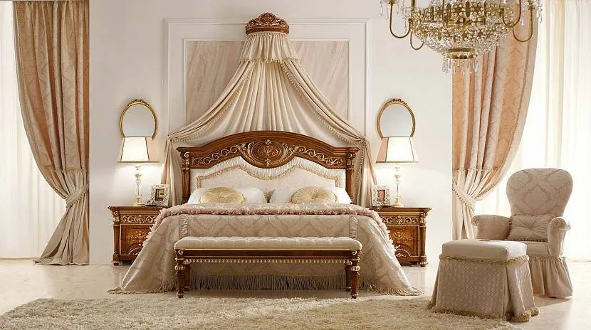 В классическом дизайне нет разрозненных предметов интерьера. При оформлении берут элементы из одного комплекта. Центральную часть комнаты занимает кровать. Массивное ложе с резным (мягким) изголовьем и с изогнутыми ножками дополняет позолота или кованые детали. Над зоной сна монтируют балдахин из полупрозрачного тюля или роскошных плотных драпировок.