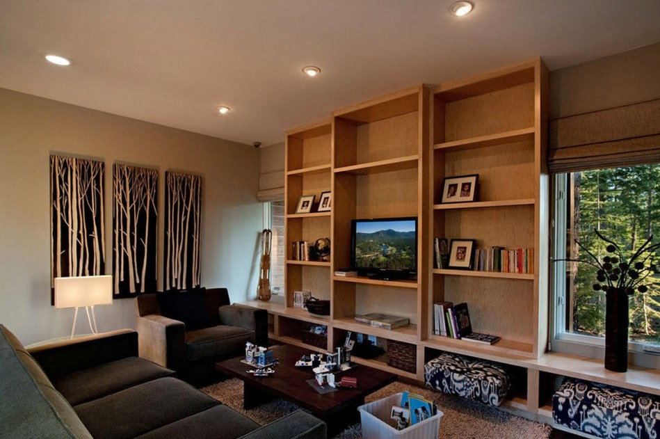 Необычно в зале будут смотреться пуфы вместо диванов и кресел, а также подвесные полки для зонирования комнаты.