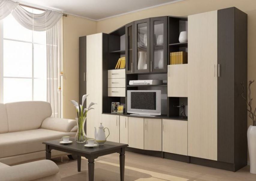 Очень популярны в гостиных модульные стенки: можно в них выделить целые отсеки под посуду или коллекцию ваз.