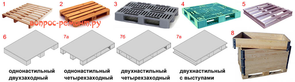Однонастильный 2-х заходный грузовой поддон (поз. 1 и 6 на рис.) – ровесник египетских пирамид. По крайней мере, первые его изображения известны со времен их строительства. Современные европаллеты (поз. 2 и 7а) делаются однонастильными 4-х заходными. Подробнее о них см. ниже, т.к. именно с ними вам скорее всего придется иметь дело.