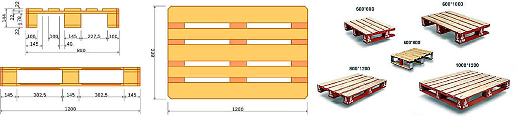 Европаллеты отличаются от традиционных грузовых поддонов настилом из досок разной ширины. Этот нехитрый прием позволил увеличить из оборачиваемость до 3-7 циклов под полным грузом при условии периодической ревизии. Типоразмеров европаллет существует несколько (справа на рис.), в отличие от утверждений в большинстве популярных источников. Вам скорее всего попадутся наиболее ходовые паллеты1200х800. Чертежи такого поддона даны слева на рис., по ним можно рассчитать, сколько досок и отрезков бруса выйдет из одного поддона.