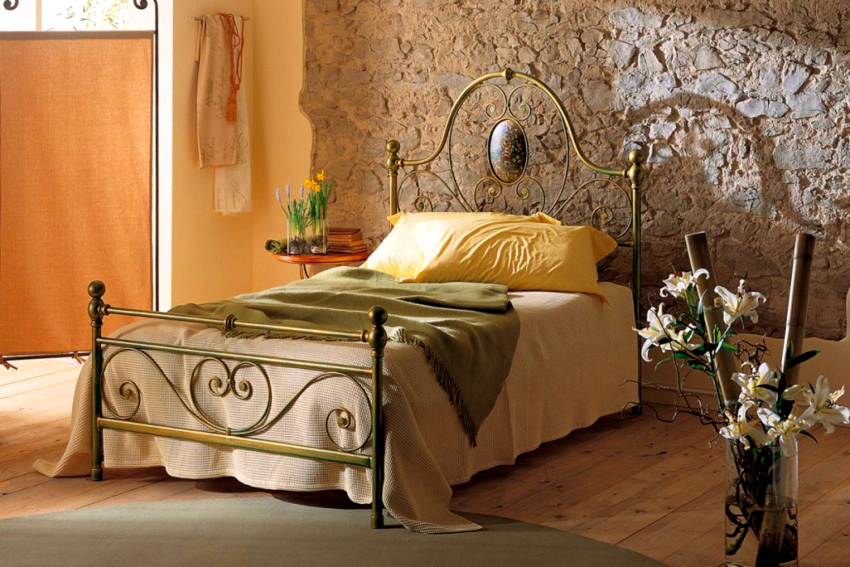 С особым вкусом подбирается текстиль, форма одеял, подушек. Кованая кровать будет гармонировать со стилистикой помещения, если выбирать растительные орнаменты, гобелен.