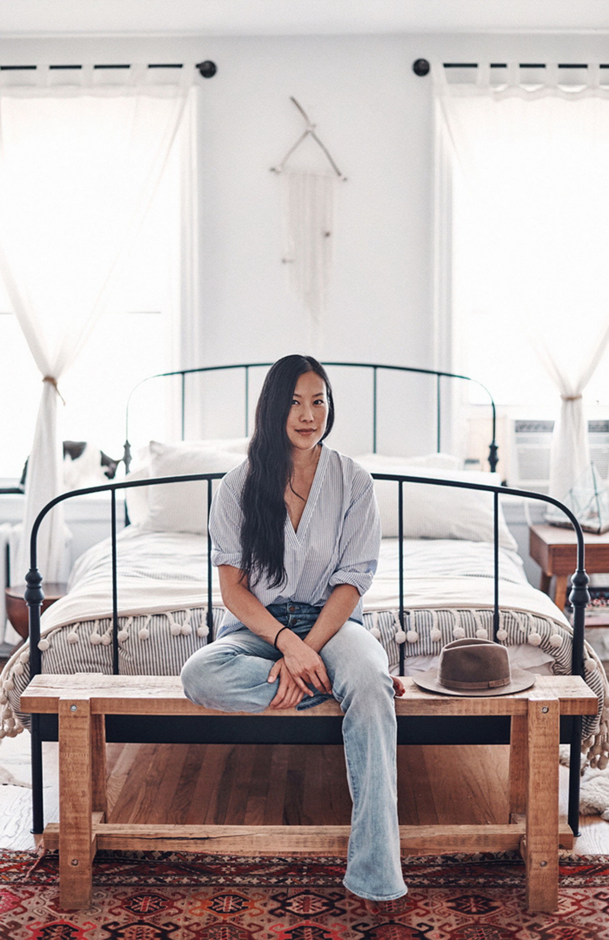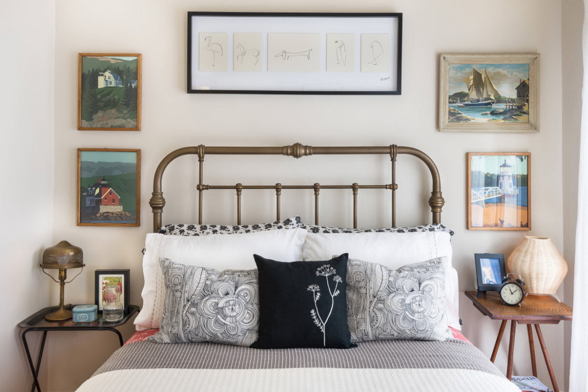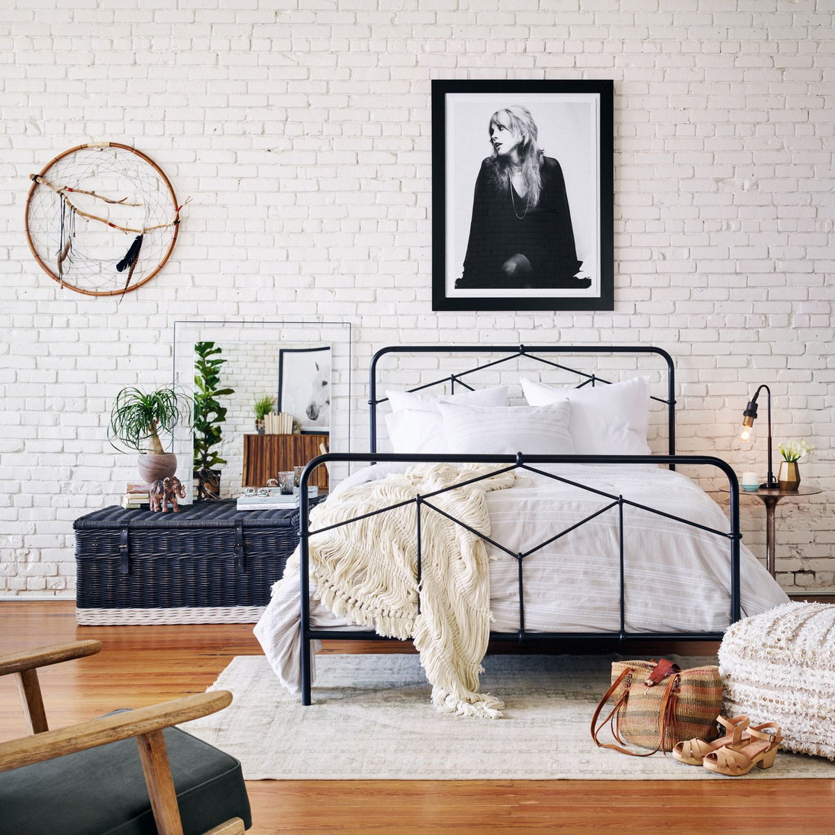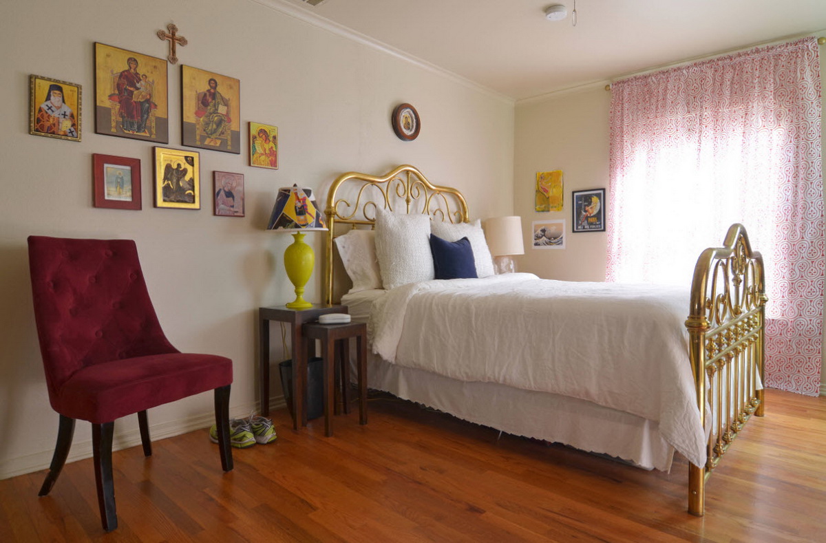 кованная спинка с замысловатым узором украсит эклетичный интерьер спальни