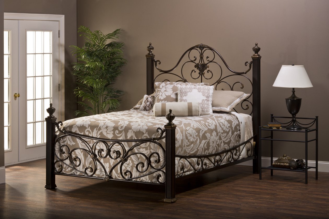 Металлические ложе приобретают для просторных помещений. К ним подбирают светильники, зеркала в оправах того же стиля. Ажурную ковку имитируют из пластика, можно найти изящные будуарные столики, банкетки.