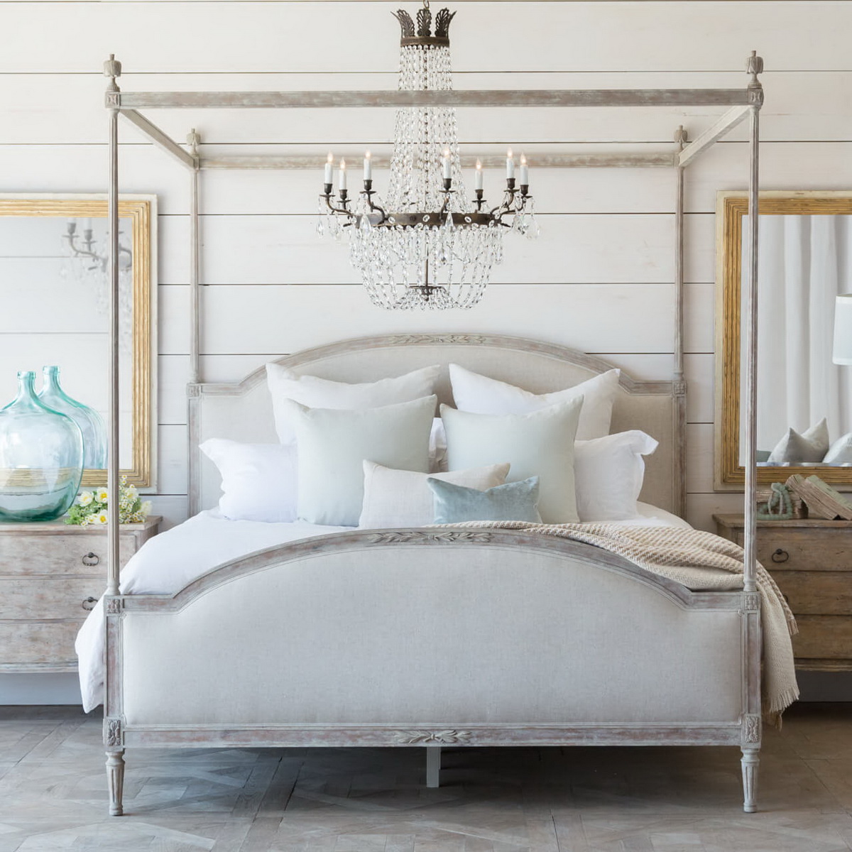 Ощущение спокойствия и защищенности обеспечивают кровати с перилами для балдахина. Такое решение напоминает нам о детстве, когда мы строили «домик» из покрывал и уединялись в нем, как в личном мире.