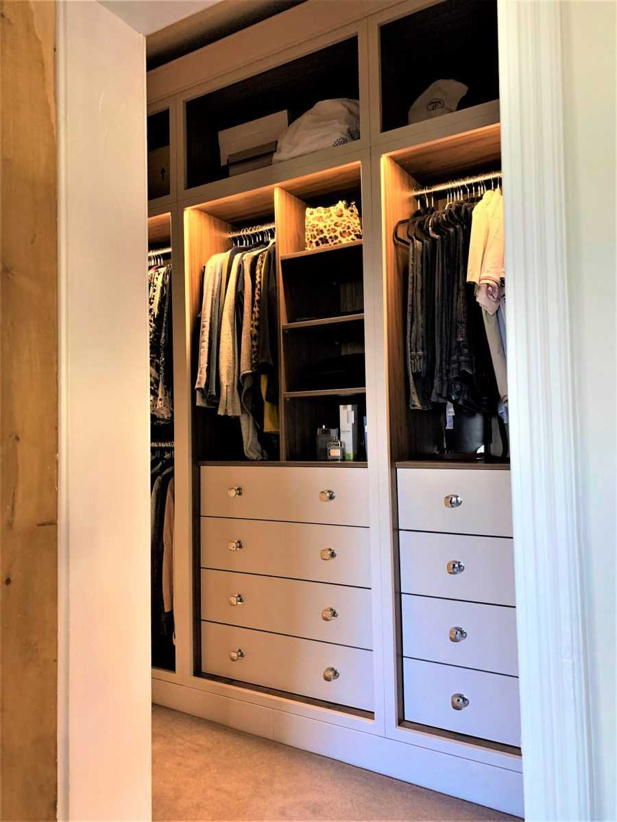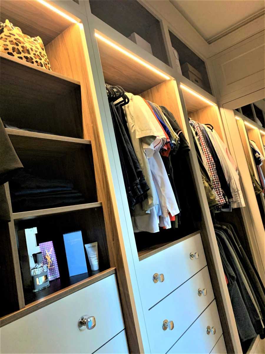 Не менее важным элементом в спальне является шкаф. Если размеры помещения позволяют, можно организовать целую гардеробную. Чтобы она была вместительной, используют модули разных размеров, в которых вещи могут храниться как в сложенном виде, так и на штангах. Если же комната имеет небольшие габариты, следует ограничиться шкафом. Однако даже в этом случае он будет состоять из нескольких переставляемых секций с достаточной вместимостью.