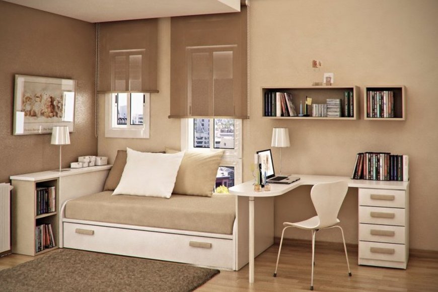 Желательно использовать модульную или трансформирующуюся мебель: кровать-трансформер, убирающуюся в шкаф, или диван, чтобы в дневное время было больше свободного пространства.