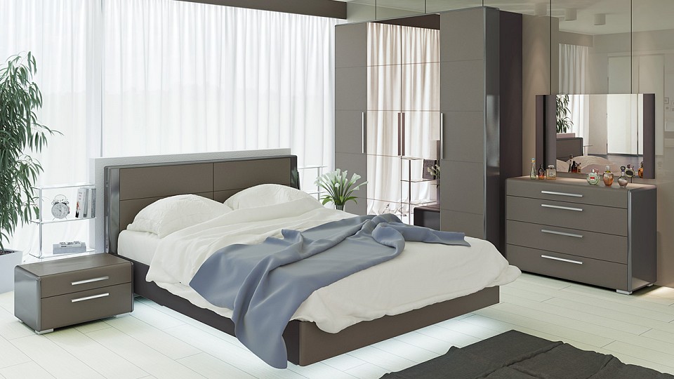 Современный спальный гарнитур выполнен в едином стиле и составляет основу дизайна комнаты
