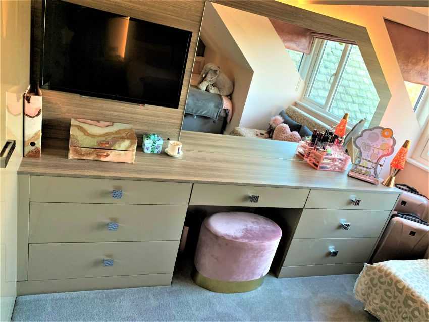 Компактно в маленькой комнате будет выглядеть подвесная мебель — тумбочки и туалетный столик не займут много места, но создадут уют.