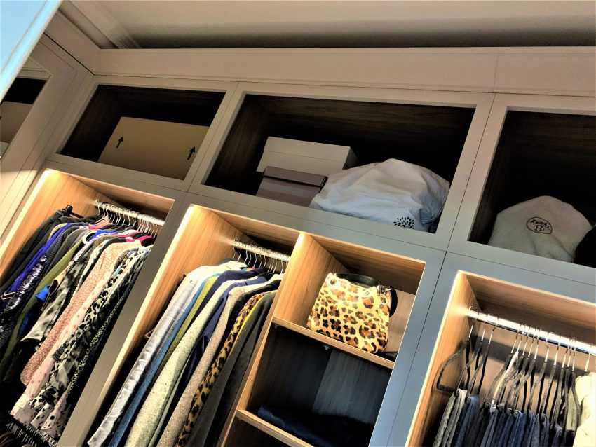 Следующий немаловажный элемент в спальне — гардеробная или шкаф. Выбирая этот предмет меблировки, ориентиром послужит метраж и кубатура помещения. Создать вместительную гардеробную позволят модули разных размеров для размещения вещей на штангах и в сложенном виде. Если параметры помещения не позволяют вместить в нее гардеробную, стоит ограничиться шкафом, который также подразумевает наличие нескольких переставляемых вместительных секций.