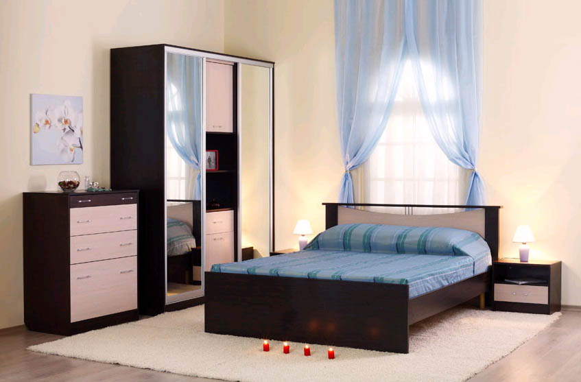 Для маленькой спальни лучше подбирать светлую мебель, что позволит зрительно увеличить пространство. Если же комната большая, то мебель может быть любого цвета.