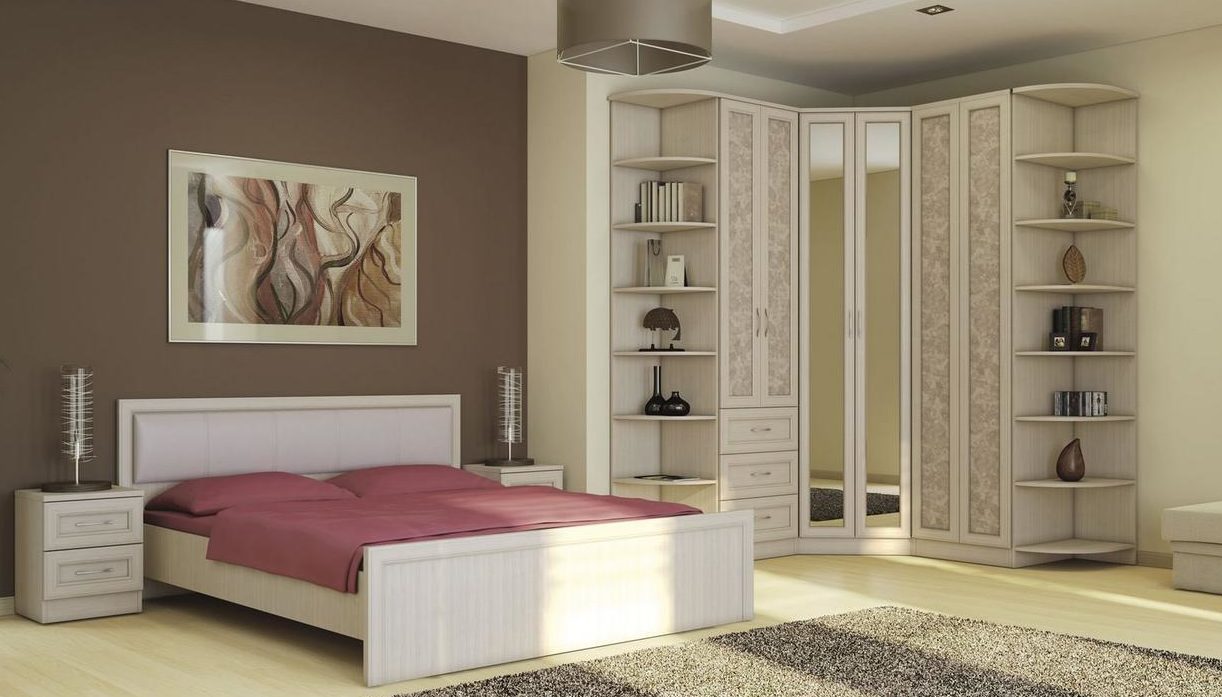 - Угловой шкаф. Модульные спальни с угловым шкафом обычно очень удобны. Такая мебель вместительная, а места занимает мало.