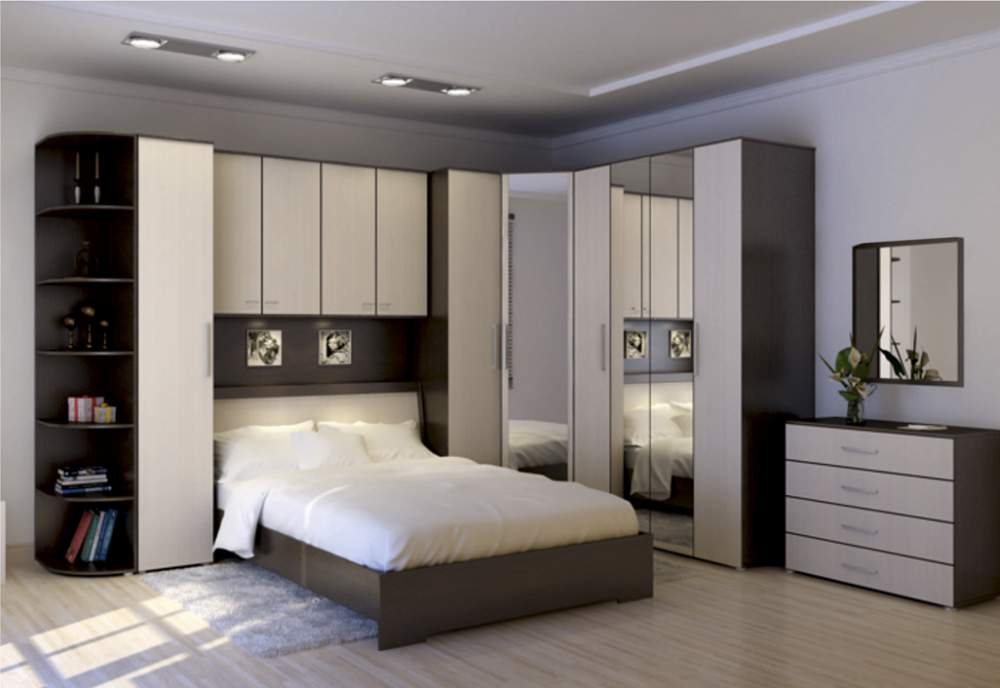 К наиболее популярным модульным спальням относятся угловые конструкции. В перечень такого мебельного гарнитура входят кровать с угловым шкафом, комод или туалетный столик.