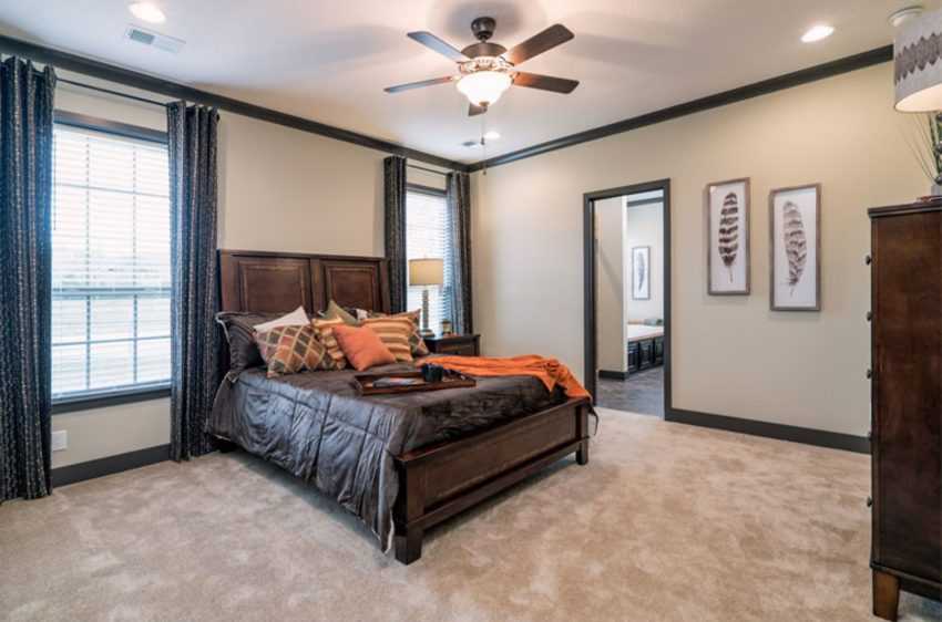 Вариант обстановки спальни в доме с двумя большими окнами