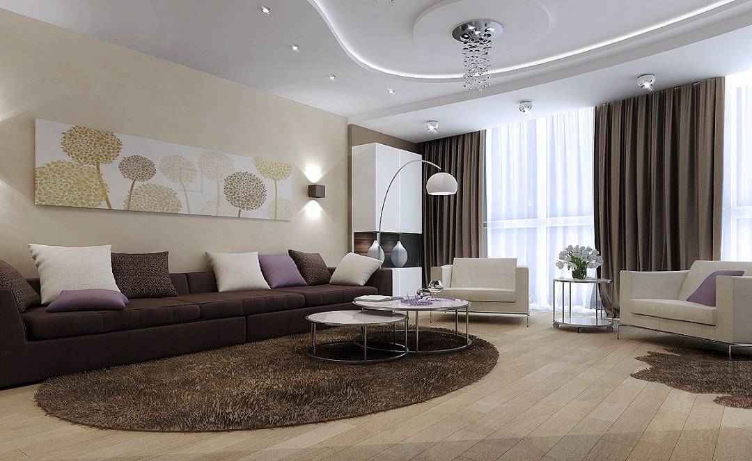 В интерьере важна умеренность и лучше не использовать слишком много цветов. Лучше всего выбирать подобный диапазон цветов, например, бежевый и белый, и с одним отличительным акцентом — красный, фиолетовый или темно-синий. Контрастность может быть достигнута не только путем выбора темной мебели для гостиной и светлых стен. Подобного эффекта можно добиться, используя более темный текстиль — шторы, подушки, чехлы для мягкой мебели или цветной ковер на фоне светлых стен и мебели.
