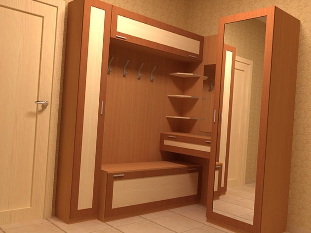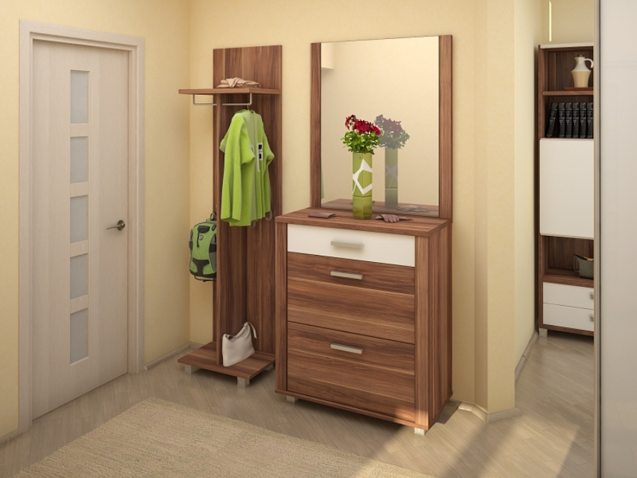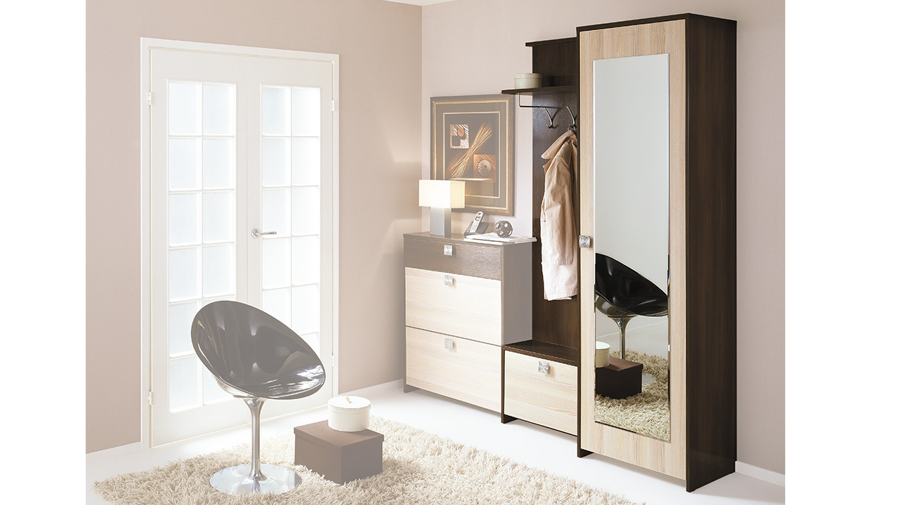 не применяйте темные расцветки для изделий. Хорошими вариантами станут цвета по типу ореха, светлых дуба и сосны, а также бука. Оттенки венге и другие темные варианты будет только нагромождать помещение; используйте зеркала на мебели. Как известно, в отражении можно увидеть другую комнату: такой ход помогает визуально расширить прихожую; соблюдайте пропорциональность предметов. Не стоит приобретать высокий шкаф купе или тумбу для обуви, занимающую все пространство. В маленьком помещении – компактная мебель; очень выгодно будет смотреться стиль минимализма: не располагайте множество мелких вещей на поверхностях. Если пространства мало – его лучше разгрузить, не заставляя горизонтальные плоскости