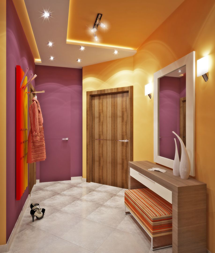 Освещение прихожей, кроме случаев каких-то совершенно специфических индивидуальных пожеланий, требуется как можно более близкое к бестеневому (обволакивающий свет). Иначе все дальнейшие усилия по организации пространства могут быть сведены на нет, и тесная комнатушка покажется еще теснее; поверхности прихожей должны создаваться тоном и фактурой, а не игрой светотени, для нее просто нет места. То есть, потолок в коридоре в целом должен быть источником рассеянного света и сам как бы растворяться в нем. Исходя из этого и выбираем варианты оформления потолка.