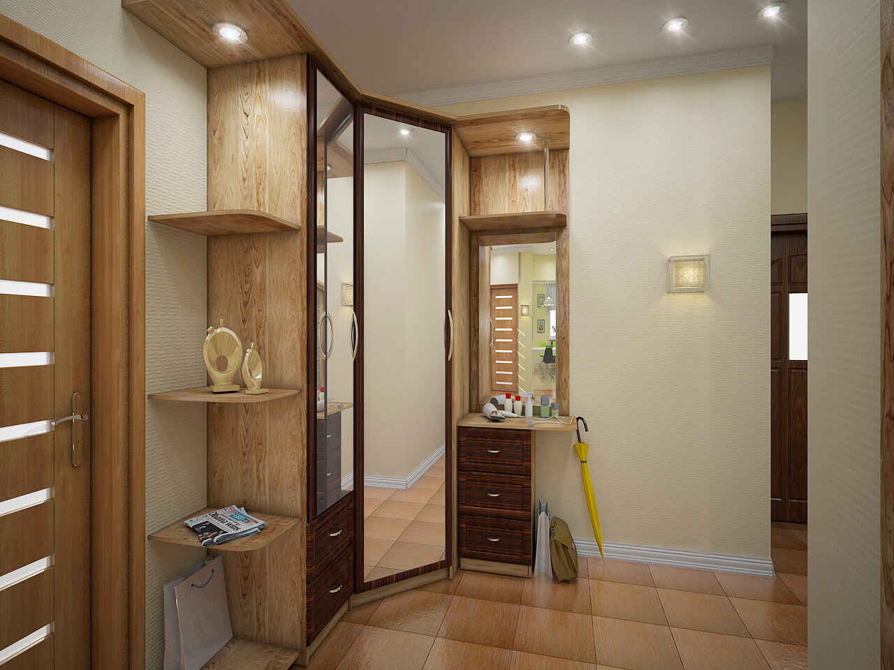Хотя и кажется, что для маленькой прихожей практически невозможно подобрать мебель, однако и здесь даже после ремонта квартиры можно найти подходящее решение. Главное — помнить о том, что она должна быть простой и максимально лаконичной. Лучше всего этому требованию удовлетворяют встроенные угловые шкафы купе. Рекомендуется выбирать такие модели, которые будут мало выделяться на фоне других элементов.