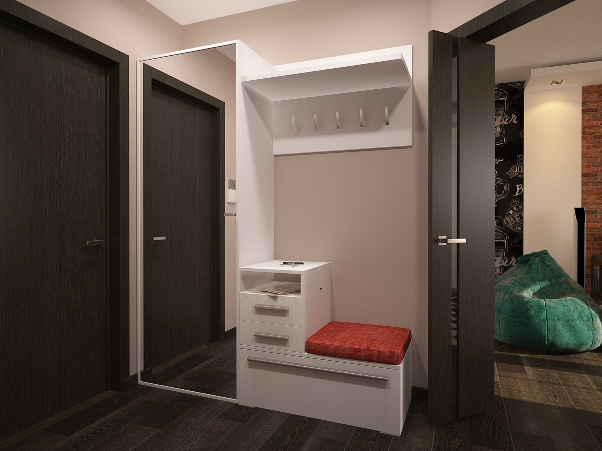 Учитывая перечисленные особенности, можно сделать вывод: в такой прихожей не может уместиться несколько человек. Заходя в квартиру, члены семьи или гости должны будут ожидать, пока предыдущий человек не снимет верхнюю одежду и обувь