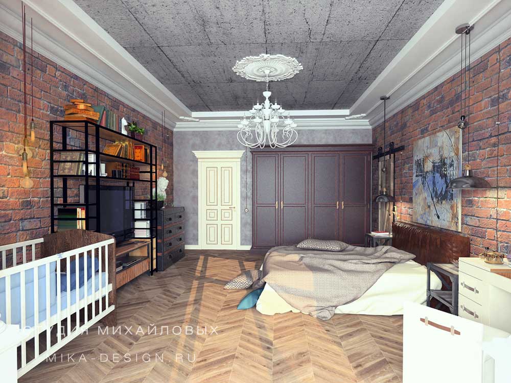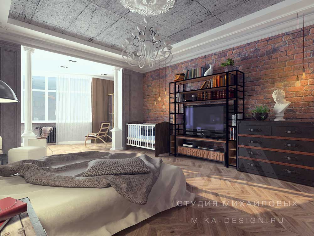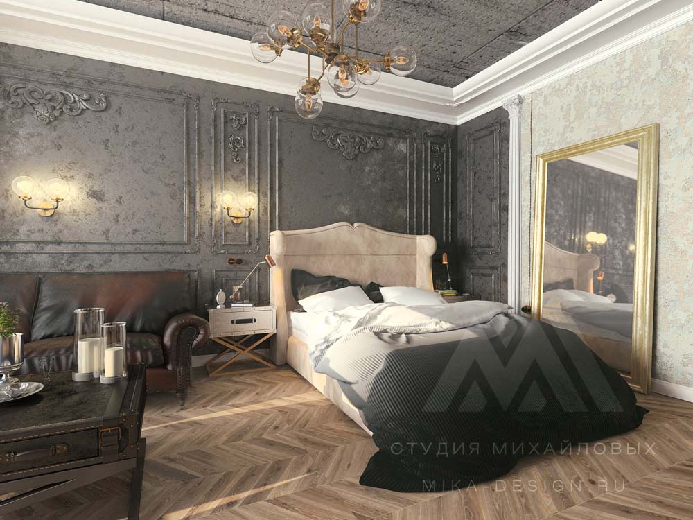 Спальня для гостей оформлена в едином для всей квартиры стиле – сочетании лофта и классики. Однако здесь особенно заметно влияние готики: из-за большого количества бетона и классического лепного декора глубокого серого цвета пространство становится похоже на интерьер старинного каменного замка.