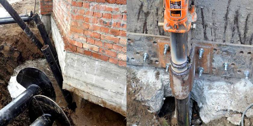 Второй вариант – это инъекционный способ. Это когда основу дома привязывают к столбам, которые заливают рядом с ним. Практически получается так, что около ленточного фундамента сооружается столбчатый. При этом столбы возводятся с двух сторон от ленты и стягиваются между собой болтами.