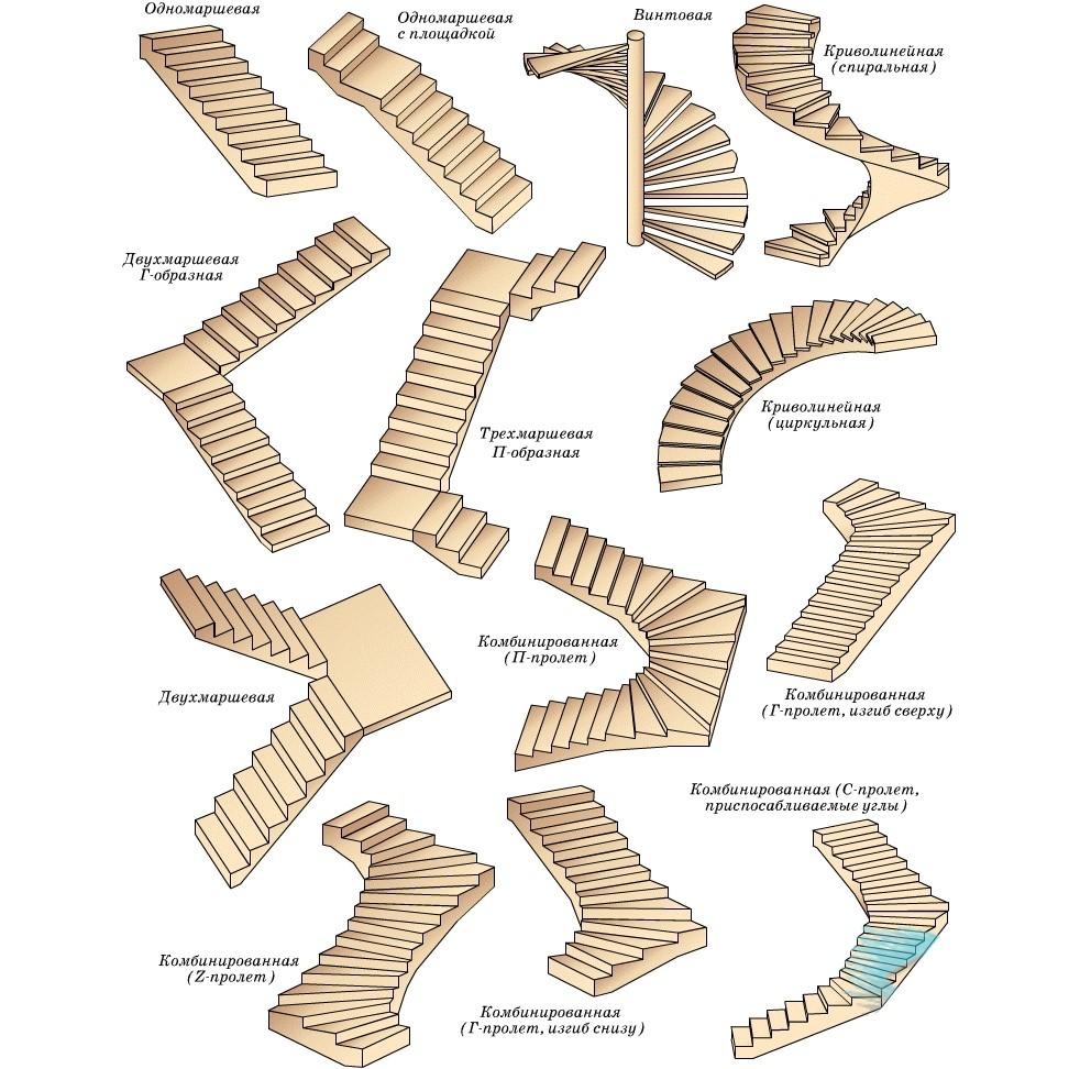 Вне зависимости от используемого материала выделяют такие разновидности лестниц: