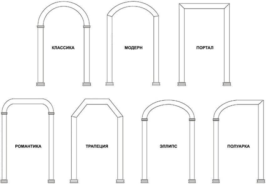 Форм для изготовления арок не так уж и много, но все они так или иначе применяются хозяевами квартир в процессе проведения ремонтных работ. Самые распространённые разновидности арок: