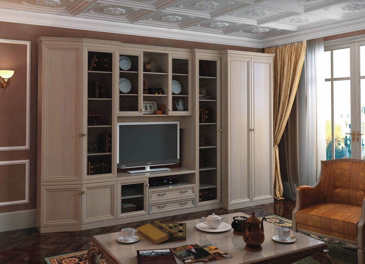 - гарнитуры для конкретной цели идеально подходящие под размеры гостиной. Чаще всего они изготавливаются по индивидуальному заказу;