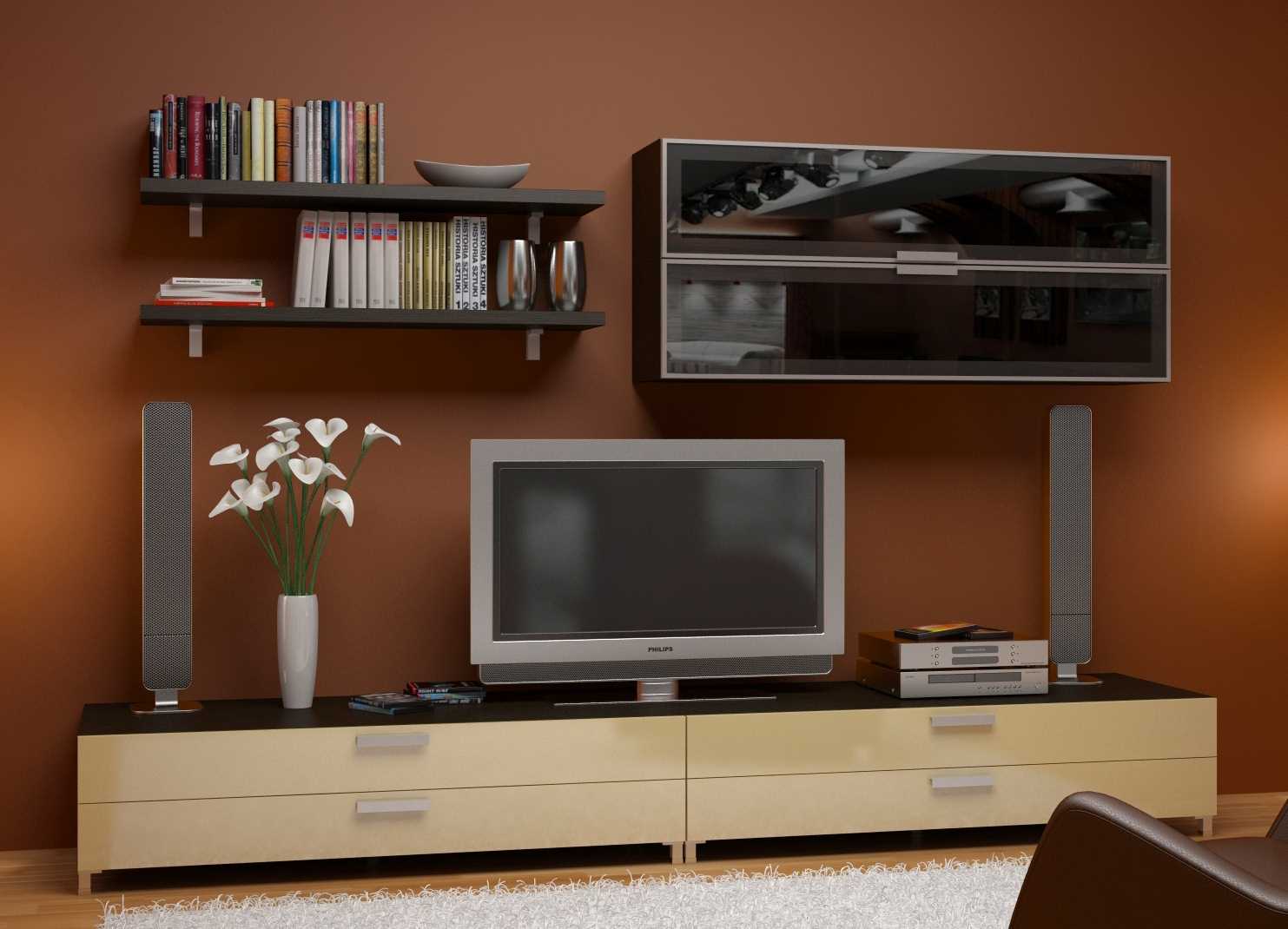 Модульные гарнитуры – это своеобразный конструктор, помогающий придать комнате удобства и индивидуальности. В центре стандартной гостиной чаще всего располагается телевизор. Для его установки можно приобрести специальную стойку или же тумбу. Правильное обрамление телевизионной панели помогут создать навесные открытые полки, с расставленными на них книгами, сувенирами и интерьерными украшениями.