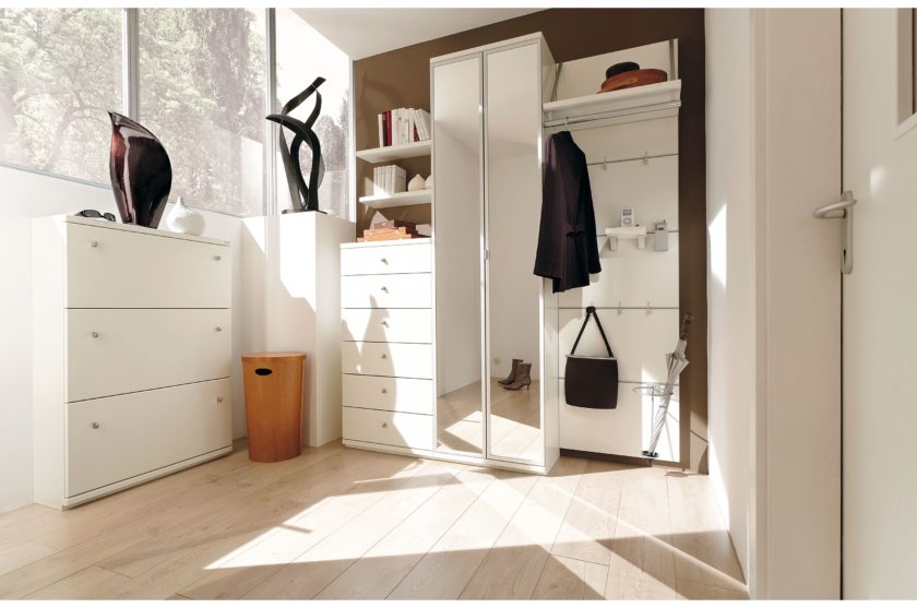 В классической прихожей также должна быть открытая вешалка. Верхнюю одежду после улицы, особенно в дождливое время года, нельзя вешать в закрытый шкаф. Шуба или пальто должны высохнуть естественным способом, поэтому и нужна такая вешалка. Пусть даже узкая, с двумя крючками, но главное, чтобы была. В модульных и корпусных прихожих вешалка часто совмещается с обувницей или тумбой. А если крючки разместить друг от друга на большом расстоянии, между ними поместится зеркало.
