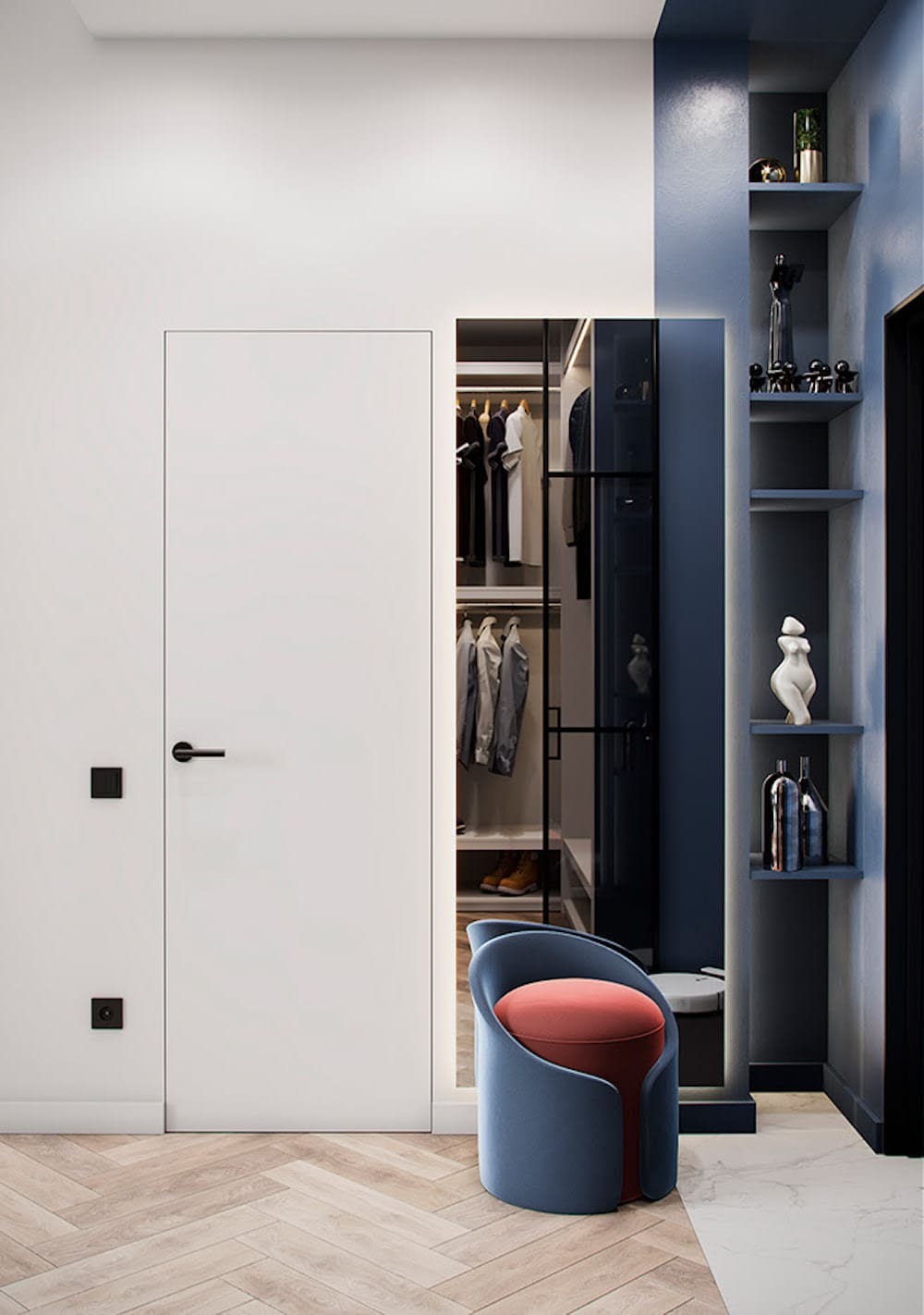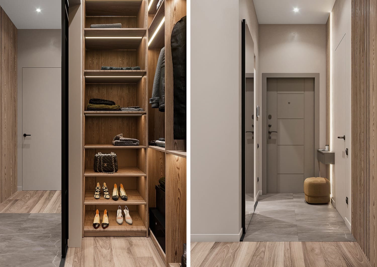 Встроенный угловой шкаф для одежды в прихожей, интересный декор.