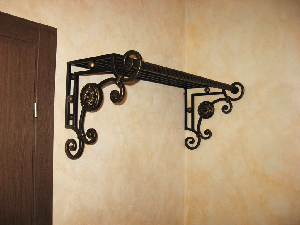 Металлические элементы — ручки, крючки, направляющие, другая фурнитура. Материал отличается высокой прочностью, поэтому в некоторых случаях оказывается незаменимым. Стильно смотрятся декоративные металлические элементы: кованая вешалка, зеркало в металлической раме.