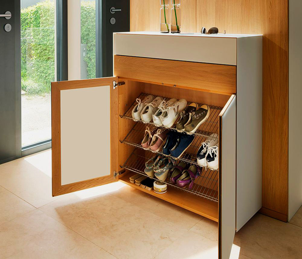 - шкафчик для обуви — это может быть стеллаж без дверок, тумбочка с выдвижными ящичками, банкетка с полками. Данный предмет мебели крайне необходим в любой прихожей;