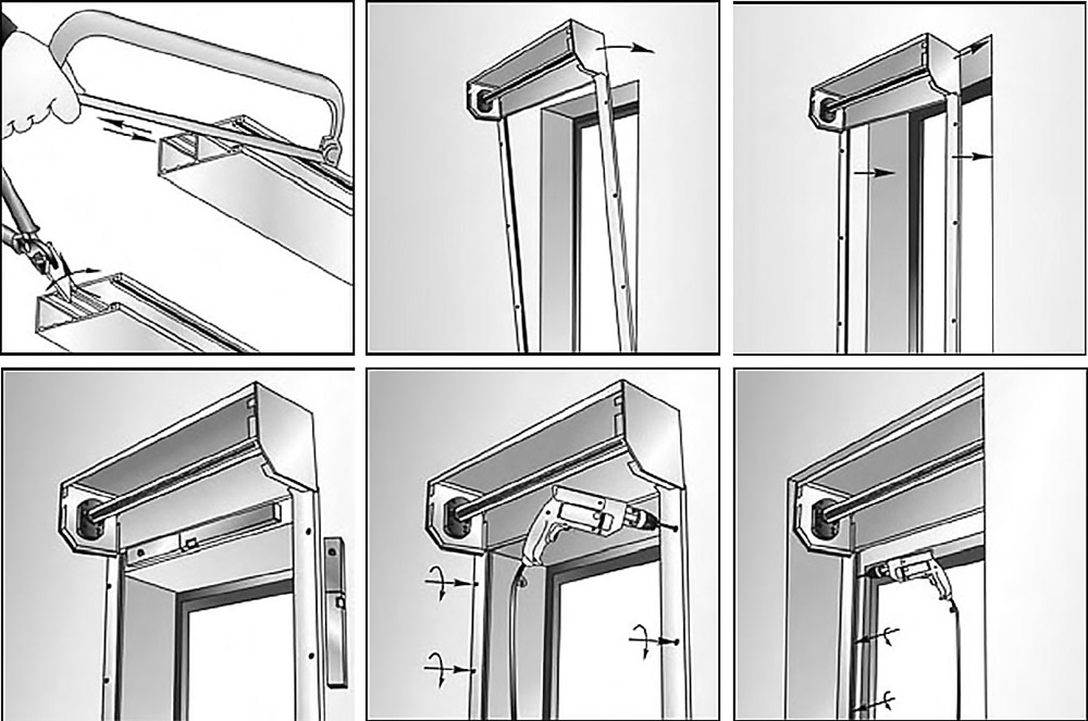 После подготовки короб с валом в сборе вставляется пластинами в полости направляющих, затем весь каркас примеряется к проёму и сдвигается с равномерными отступами по сторонам. Предварительное крепление начинают с верха одной направляющей, затем регулируют короб в горизонте и крепят верх второй шины. После этого направляющие выравниваются по вертикали и крепятся в остальных точках.