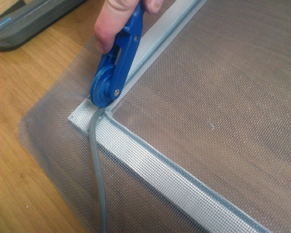 Установка москитной сетки на пластиковое окно начинается с изготовление каркаса и крепления в нём сетки. Для этого на ровную поверхность укладывают профиль и соединяют его уголками. На профиль укладывается сетка, натягивается и фиксируется шнуром который утапливается в специальный желоб в профиле с помощью специального валика.
