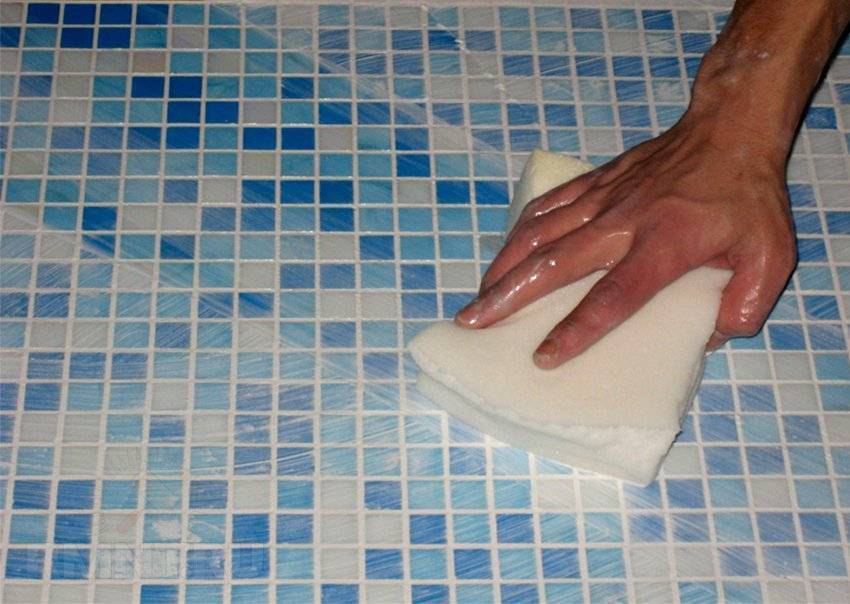 - Далее, не дожидаясь полного затвердения раствора, при помощи губки удаляют с мозаики следы затирки.