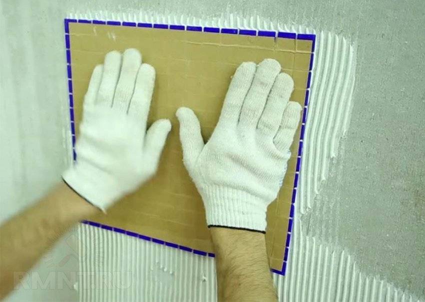 - Плитки прижимают к поверхности только после того, как точно выполнят их подгонку.