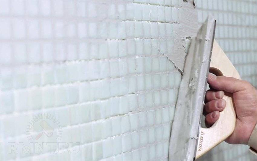 Если поверхность ровная и зубчатый шпатель выбран правильно, при прижатии плиток не должен проступать клей, попадая на их лицевую поверхность. - После укладки мозаичных плиток по всей поверхности и полного застывания клеевого раствора начинают затирку швов: