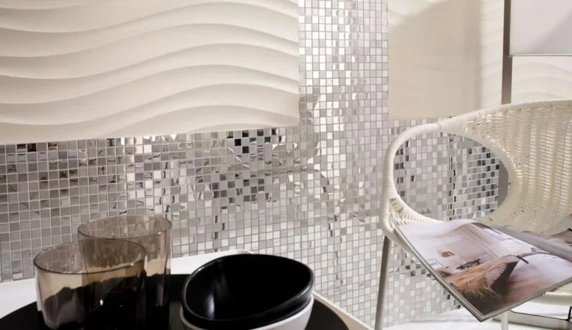 - Зеркальная мозаика способна сделать светлее темное помещение, но в светлой комнате обилие блеска может быть неприятно.