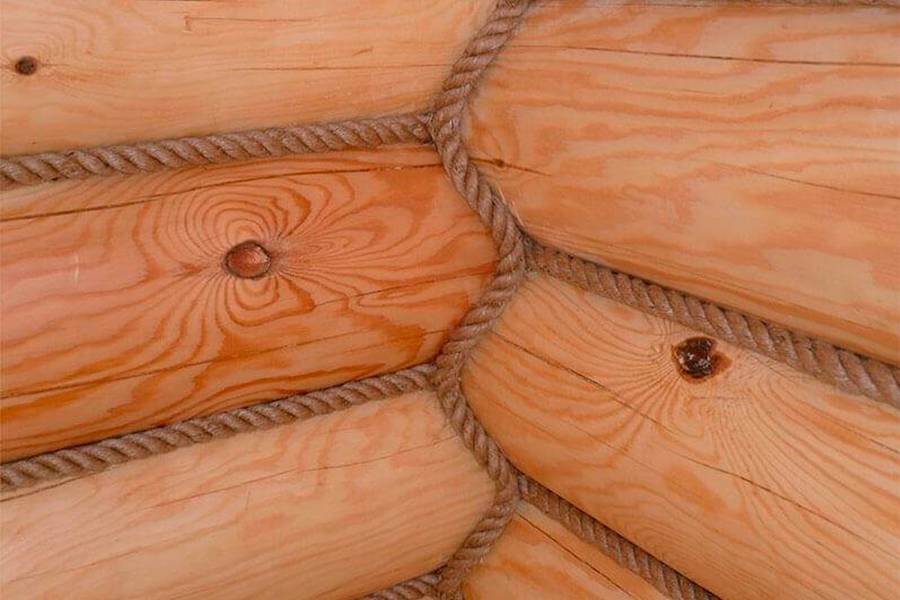 Обычно такой материал используют для обработки конструкции из рубленного бревна. Благодаря пластичности джута, во время усадки он идеально заполняет пространство, подстраиваясь под просевшую поверхность.