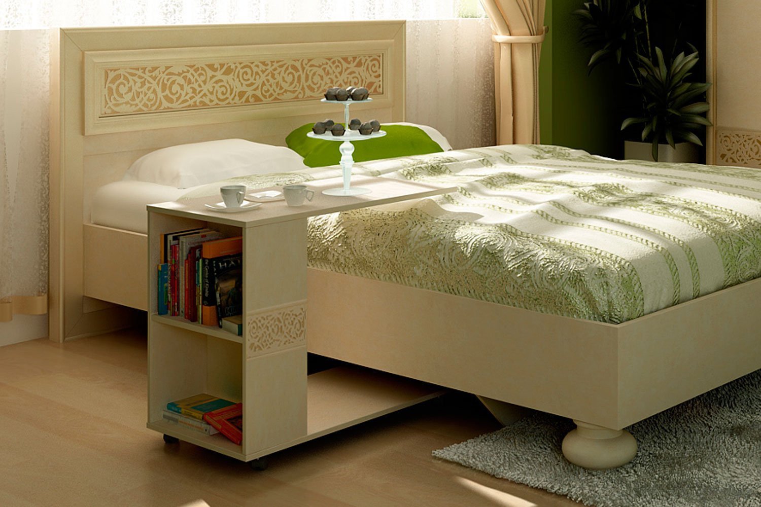 Есть кровати, к которым присоединены тумбочки, трельяжи и прочие дополнительные предметы. Таким образом, покупая кровать, вы сразу получаете почти всю необходимую мебель в спальню. Плюс этого решения в том, что ненужно заморачиваться и подбирать все это по отдельности, но, с другой стороны, при попытке сделать перестановку или заменить какую-то часть этого комплекта возникнут большие трудности.