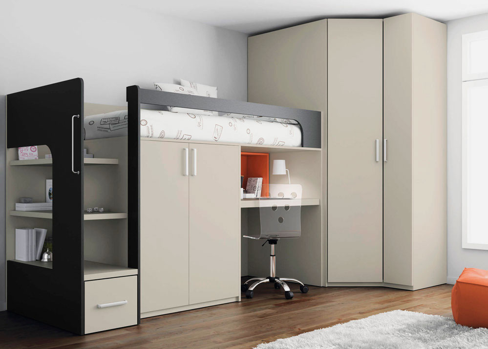 - В моделях для подрастающего поколения, как правило, спальное место сверху, а снизу — книжные полки, гардероб и рабочий стол. Такой вариант позволяет экономить площадь.