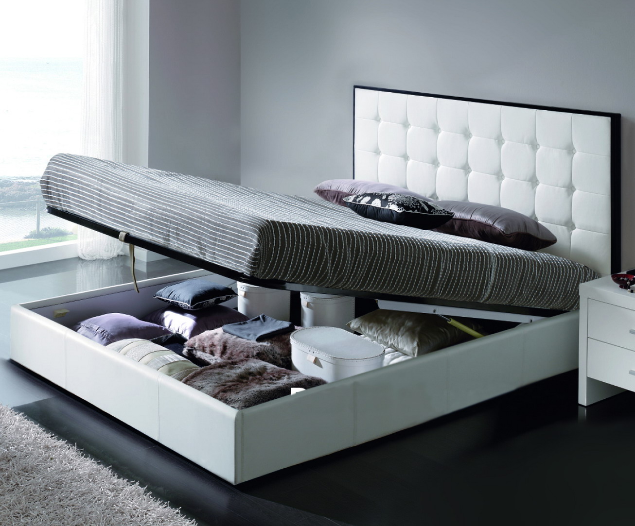 Если пьедестал не нравится, можно сэкономить пространство за счет крупных выдвижных ящиков под кроватью, вмещающих постельные принадлежности. Это позволите обойтись без покупки комода для хранения белья, подушек, одеял.