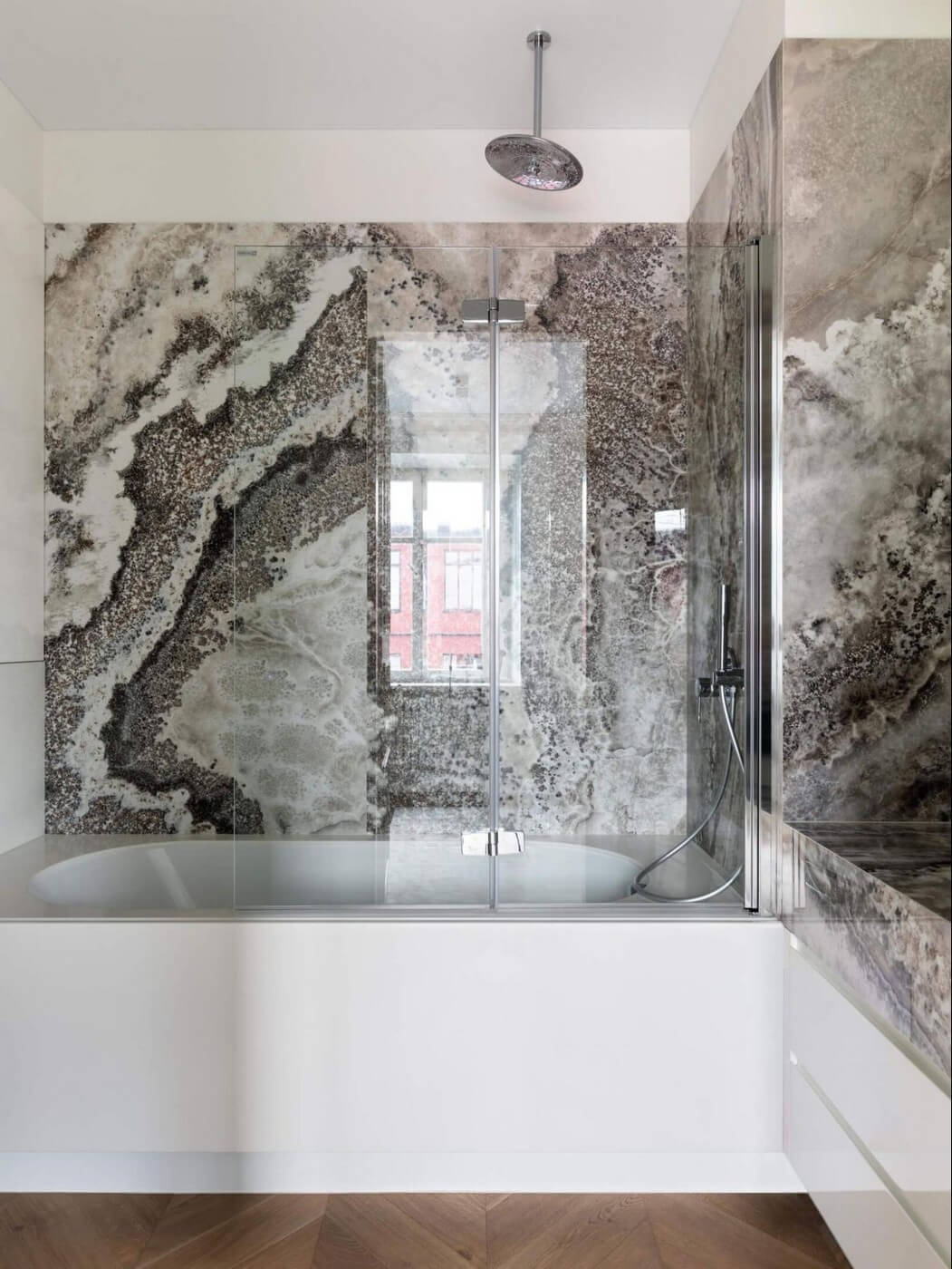 Использование мрамора или керамогранита и плитки под мрамор украсит любую, даже самую простую ванную комнату. Проект «Сталинский ампир», дизайнер Евгений Бобрик