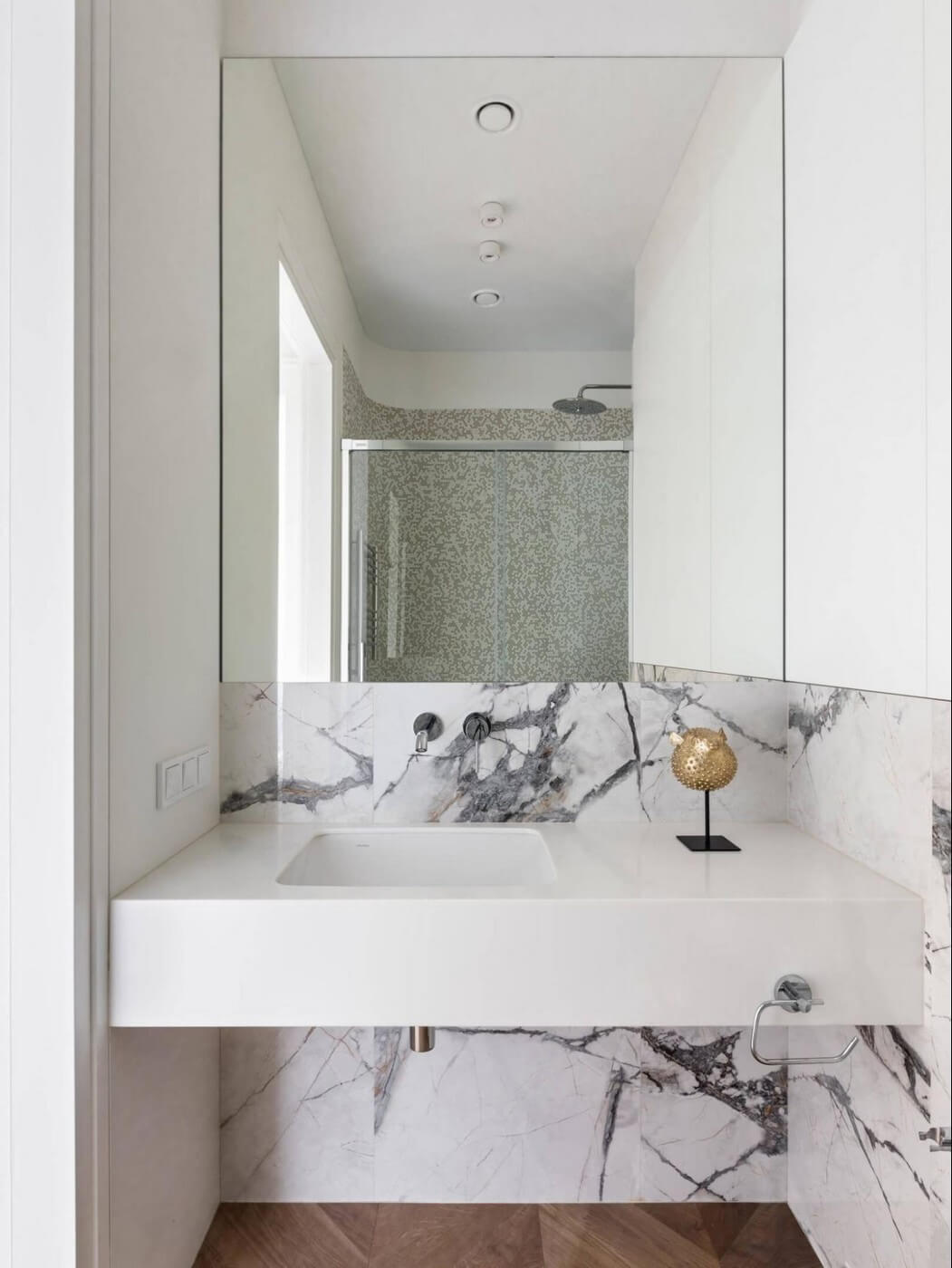 В небольшом санузле или ванной комнате использование светлого мрамора позволяет визуально расширить пространство. Проект «Сталинский ампир», дизайнер Евгений Бобрик
