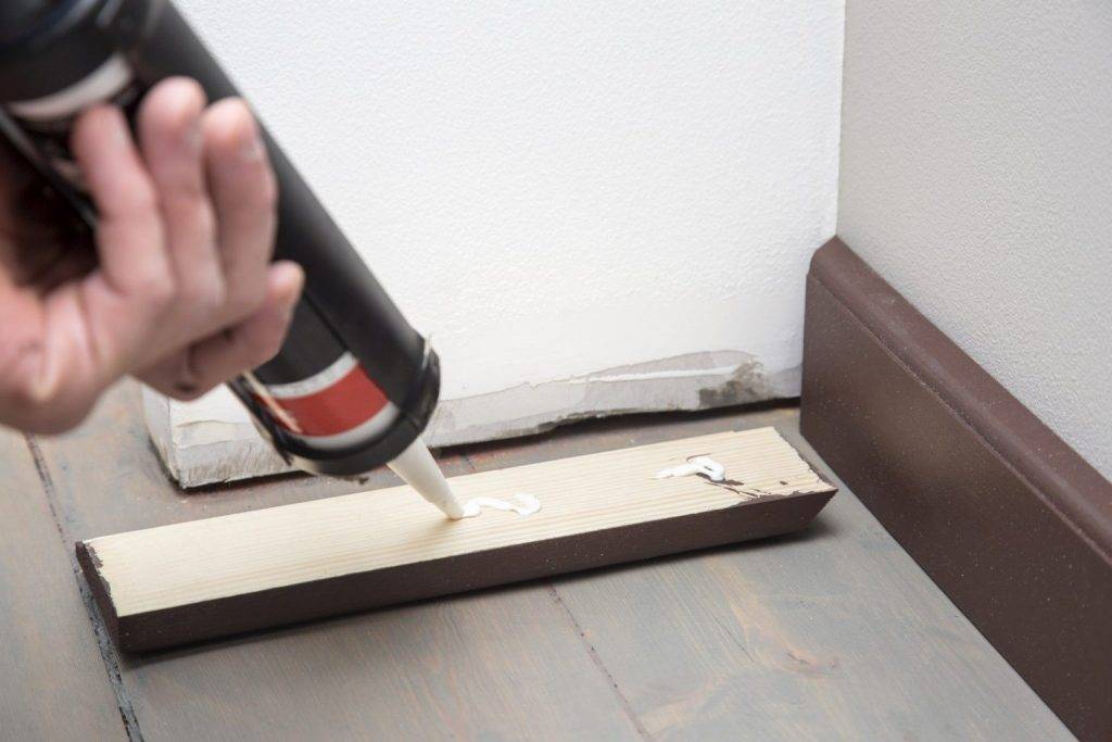 - Плинтуса, фиксируемые на адгезионные составы, которые подбираются, в зависимости от конструктивного исполнения отделки чистового слоя. Чаще всего, для таких целей применяются универсальные жидкие гвозди.