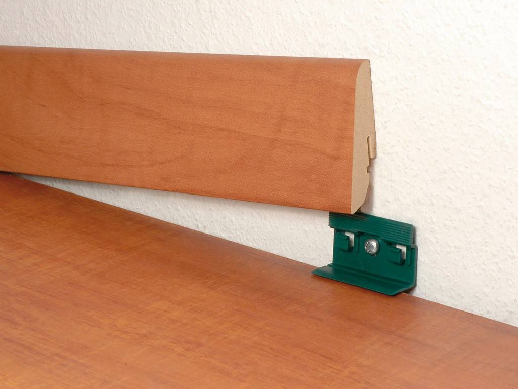 - Высокотехнологичные изделия, оснащаемые на заводе фиксирующимися пластинами. После монтажа ответного элемента на стене, плинтуса просто защёлкиваются на клипсы, что обеспечивает неразрывное прочное крепление.
