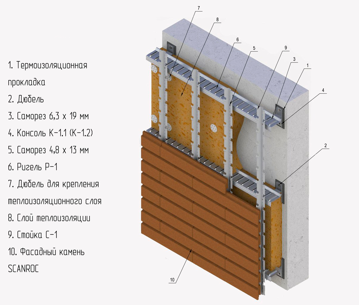 Шаг профиля 60см. Сначала устанавливают кронштейны с функцией самовыравнивания на саморезы. Установка производится по одной вертикали. На кронштейны ставят П-образные вертикальные профили. Затем крепят утеплитель, пароизоляцию. Затем монтируют профлист. Крепят саморезами со шляпками и шайбами.