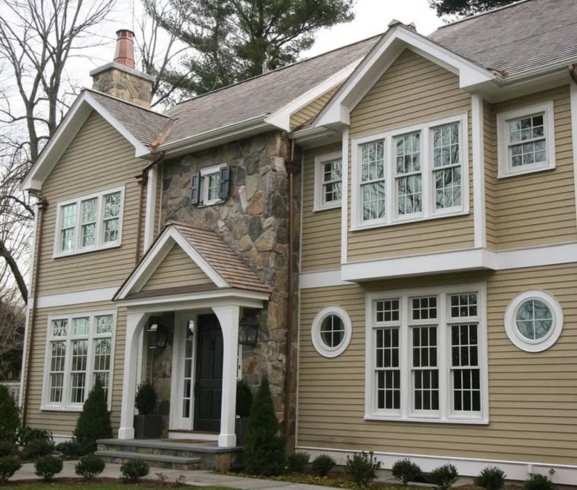 - Строгая классика. Оконные проемы обрамляются наличниками и подоконными карнизами. Присутствуют рустованные камни или их имитация.